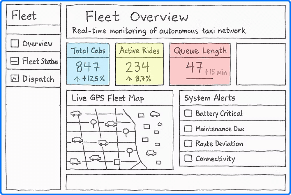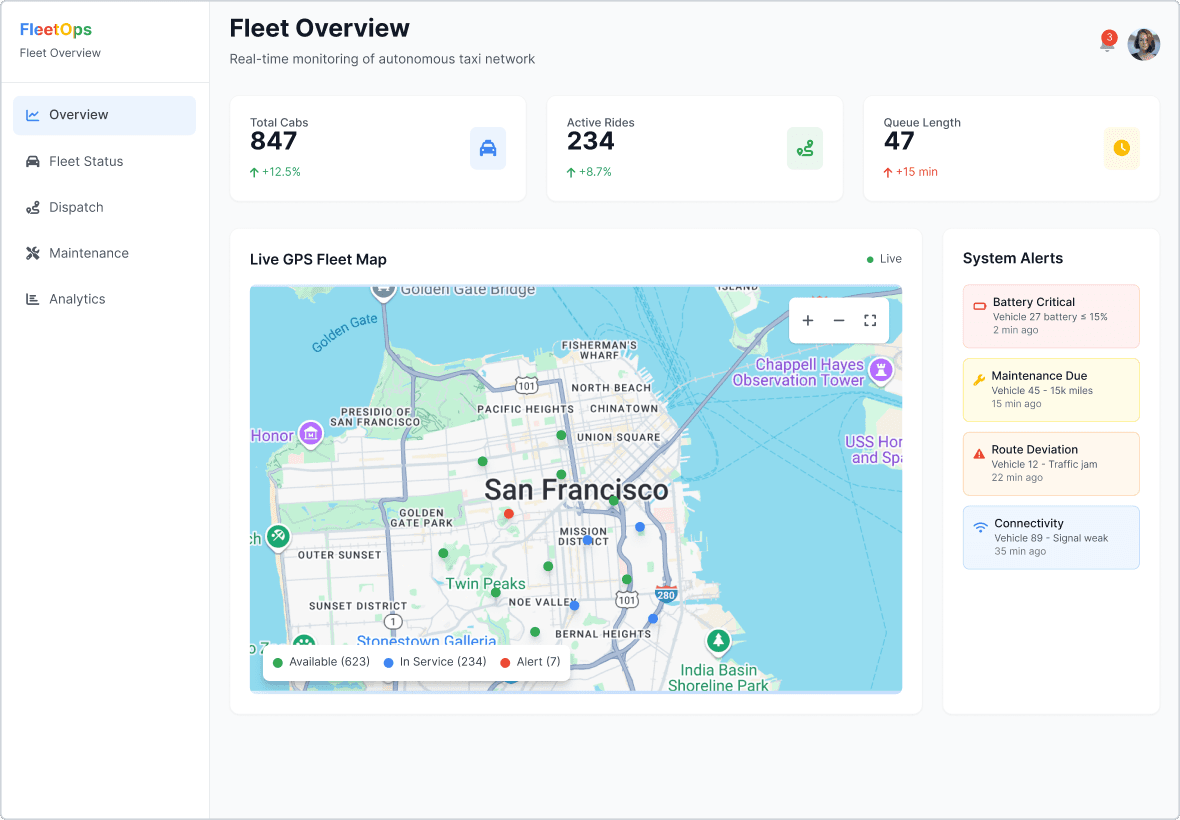 Design a simulated fleet management dashboard for autonomous taxis that envisions how operators might monitor, dispatch, and maintain vehicles at scale, through a centralized, actionable, and operator-focused interface.