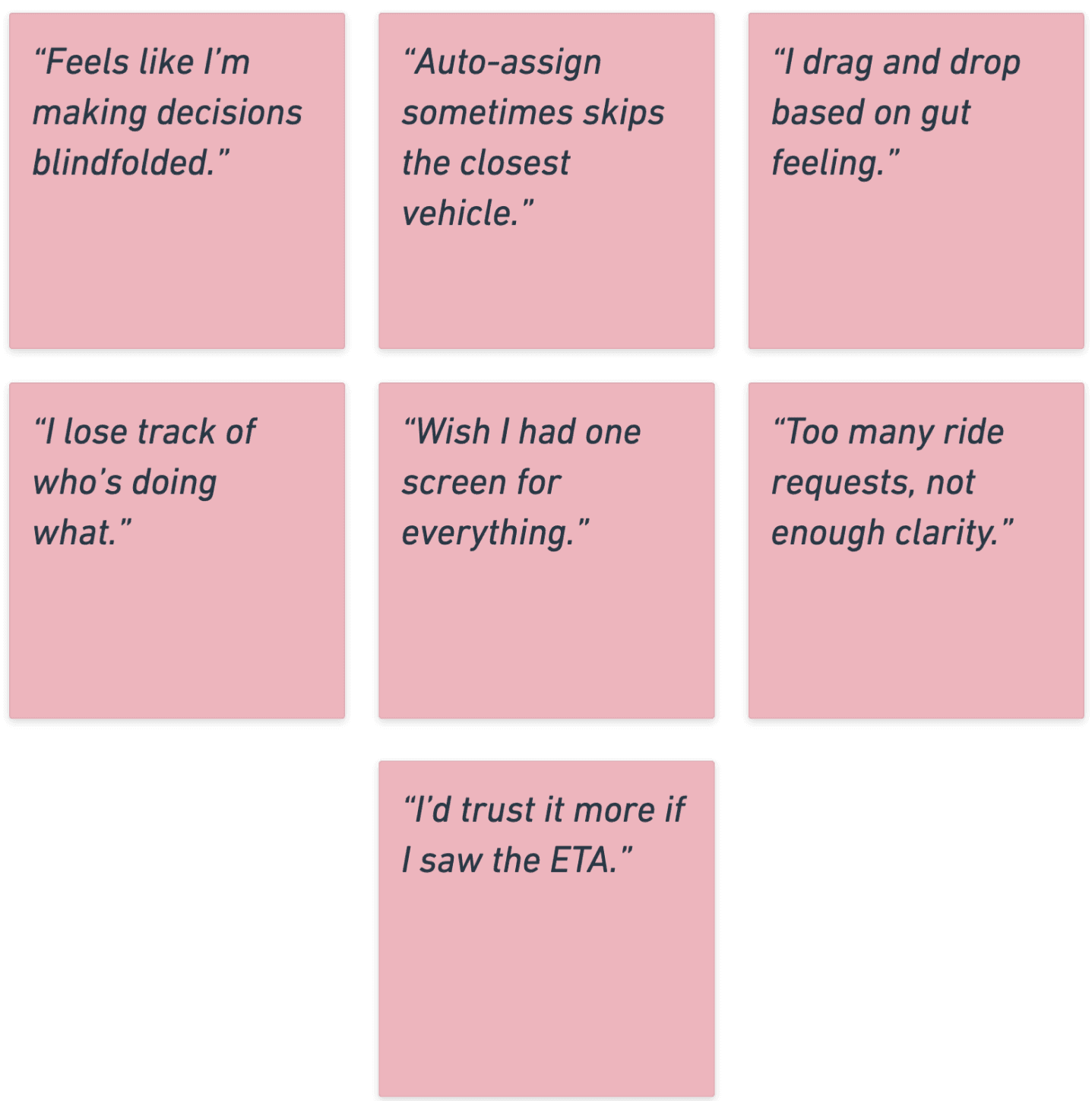 Without ETA context or visual feedback, they didn’t trust auto-assign logic and often made decisions manually.